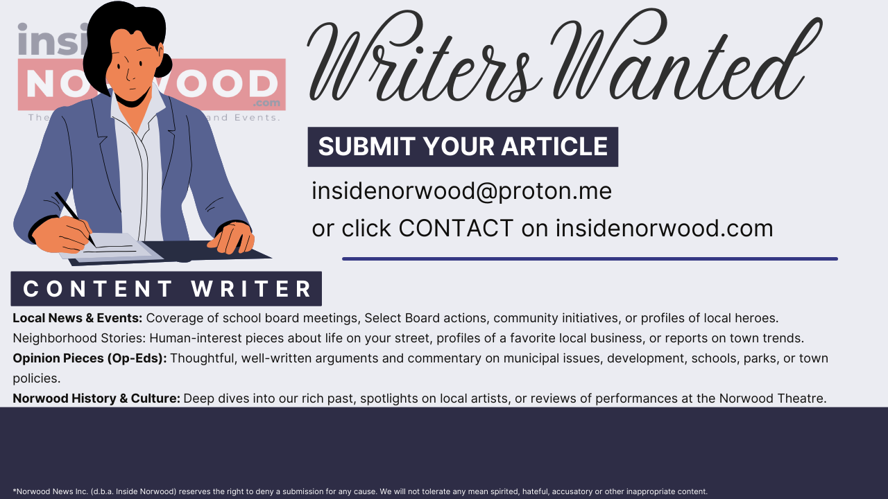 *Norwood News Inc. (d.b.a. Inside Norwood) reserves the right to deny a submission for any cause. We will not tolerate any mean spirited, hateful, accusatory or other inappropriate content. Any article submitted becomes property of Norwood News, Inc. with credit to the author. Creators will not be compensated (monetarily or otherwise) for contributions.